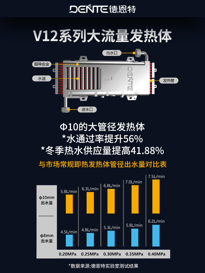 恒溫加熱沐?。篤12系列的發熱體,實現無角度安裝,將發熱體水路由傳統的1米延長至3.5米,大大降低了加熱管表面負荷功率,使熱傳導更充分,更均勻,更穩定,拒絕忽冷忽熱。大流量隨心?。篤12系列的發熱體Φ10的大管徑水通過率提升56%,冬季熱水供應量提高41.88%。(數據來源于德恩特實驗室)水電完全分離:在水路與加熱器之間采用高導熱性能的特質鋁合金鑄造,徹底顛覆了加熱管浸泡在水中的傳統,拒絕高溫結水垢,是真正的水電完全分離。