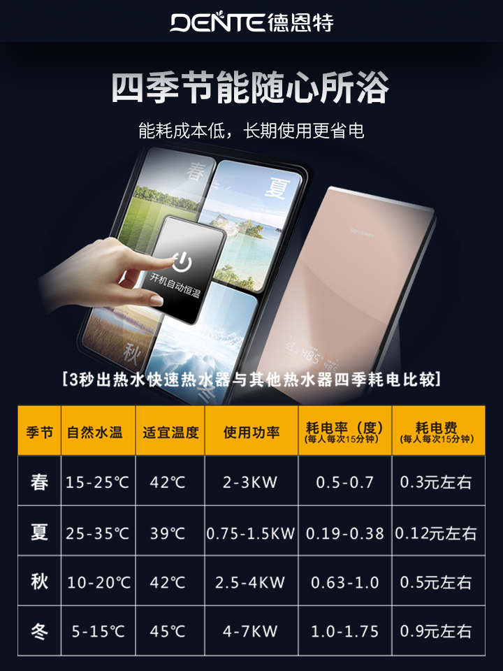 按需加熱:德恩特超導高效智能加熱,熱效率達到97.6%,用多少水就加熱多少水,避免儲水式“燒一箱水只用一半”的浪費。無儲水保溫損耗:僅在使用時用電,待機功率趨近于零,用電透明。